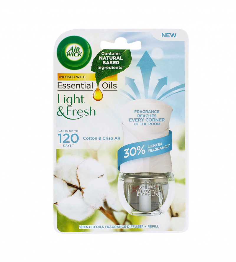 Vůně svěží bavlny Vás pohltí do světa odpočinku a relaxace. Nové vůně Air Wick „Light & Fresh“ byly navrženy tak, aby poskytovaly lehkou a jemnou vůni. Uvolňují o 30 % jemnější vůni než standardní vůně do elektrického osvěžovače vzduchu Air Wick.
