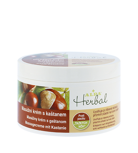 Masážní krém Alpa Herbal pomáhá uvolňovat namáhané svalstvo a zamezuje pocitu „těžkých“ nohou. Díky přítomnosti kaštanového extraktu má příznivý vliv na poruchy periferního prokrvení (studené nohy, fialové ruce), příznivě ovlivňuje pružnost a pevnost cévních stěn. Svými účinnými složkami je vhodný především při otocích nohou a při nezánětlivé formě křečových žil. Krém se snadno vstřebává a tím umožňuje rychlou účinnost.