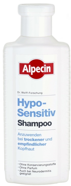 Šampon Alpecin Hypo-Sensitive Shampoo šetrně čistí vlasy a odstraňuje veškeré nečistoty. Složení bez konzervačních látek jemně pečuje o suché a citlivé vlasy. Složení je obohaceno o extrakt z šalvěje a heřmánku, které zklidňují citlivou pokožku a zabraňují podráždění. Zároveň posilují odolnost pokožky. Při každodenním používání budou vlasy i vlasová pokožka zdravé a svěží. Aktivní látky:· extrakt z šalvěje, extrakt z heřmánku.