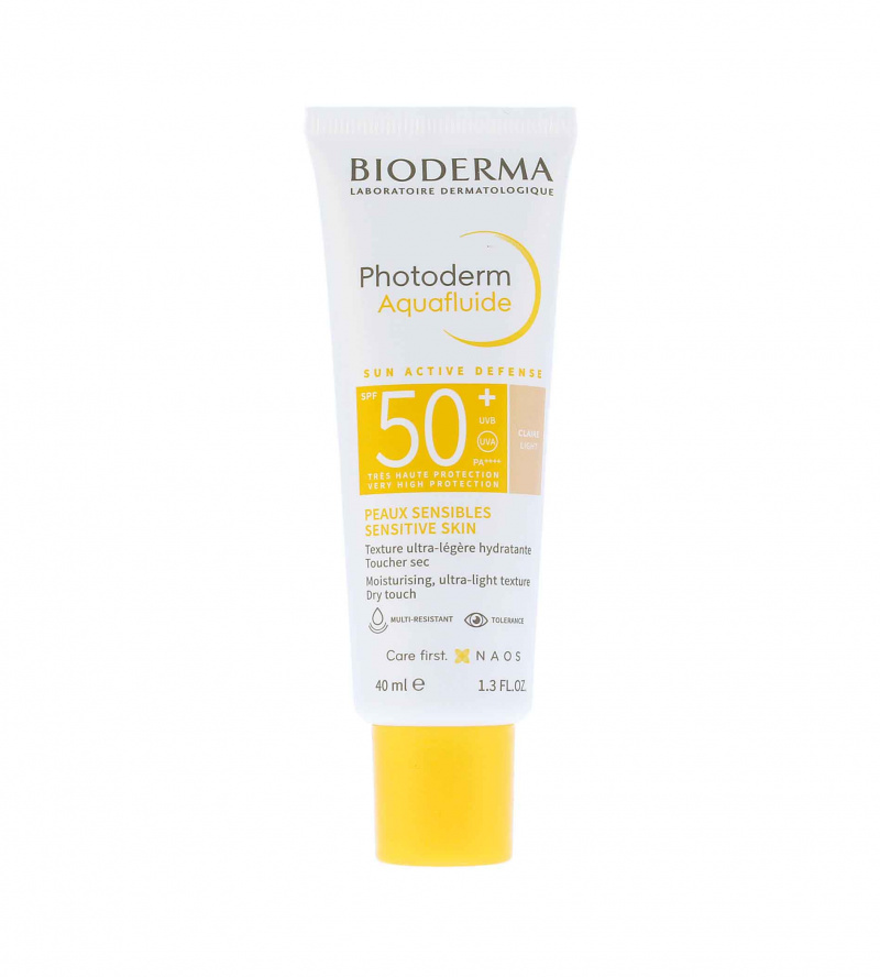 Hydratační tónovaná sluneční péče s osvěžující texturou a matným efektem Bioderma Photoderm Aquafluid SPF 50+ zaručuje velmi vysokou ochranu proti UVA/UVB záření citlivé a světlé pokožce. Technologie Sun Active Defense kombinuje UV filtry a patentovanou biologickou ochranu, která zlepšuje obranyschopnost pokožky a pomáhá tak dlouhodobě pečovat o její zdraví při pobytu na slunci. Ultralehká fluidní textura se lehce roztírá a zanechává pleť sjednocenou a zmatněnou po dobu 8 hodin.