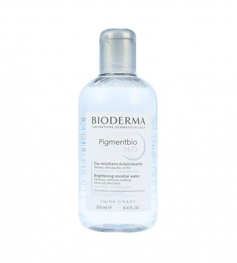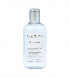 Micelární voda speciálně vyvinuta pro pokožku s poruchami pigmentace Bioderma Pigmentbio H2O jemně čistí a odličuje obličej a oční okolí. Patentovaná kombinace aktivních složek reguluje biologické mechanismy a zabezpečuje zesvětlení pokožky. Velmi dobrá snášenlivost pokožky tváře a očního okolí. Bez parfemace.