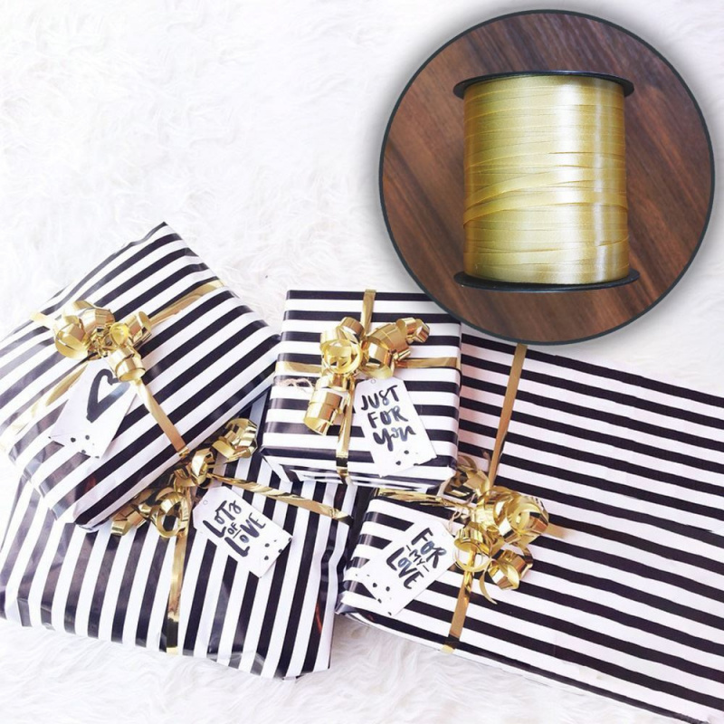 Elegantní a decentní stuha ve zlatavé barvě je skvělým doplňkem zejména k balení a dozdobení dárků všeho druhu. Ať už se jedná o narozeninový, vánoční nebo svatební dárek, jemnou lesklou stuhu rozhodně využijete. Dárková stuha je ale i skvělým pomocníkem při tvoření dekorací, tvorbě pozvánek, oznámení či jmenovek u slavnostní tabule. Také ji využijete při vázání balónků nebo květin. Klubíčko obsahuje zlatavou stuhu v délce 200 metrů. Pokud stuhou přejedete po ostré hraně krásně se navíc zakroutí. Podívejte se na naši další nabídku balících potřeb.