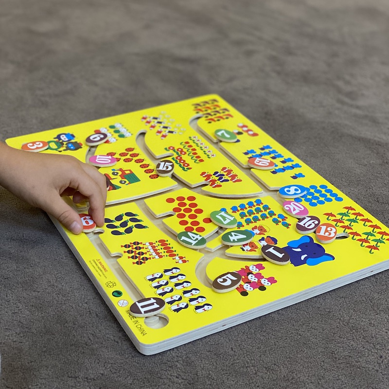 Edukativní hračka v podobě labyrintu, pomocí které se děti zábavnou formou mohou naučit pojmenovávat věci, zvířata a naučit se počítat do dvaceti. Cílem labyrintu je totiž přiřadit číslici ke správnému obrázku. Záludný labyrint navíc učí děti logickému uvažování, trénuje motorické schopnosti, trpělivost a soustřední. Labyrint ve veselém pestrobarevném provedení je vyroben ze dřeva. Seznamte své děti hravou formou se základy matematiky.