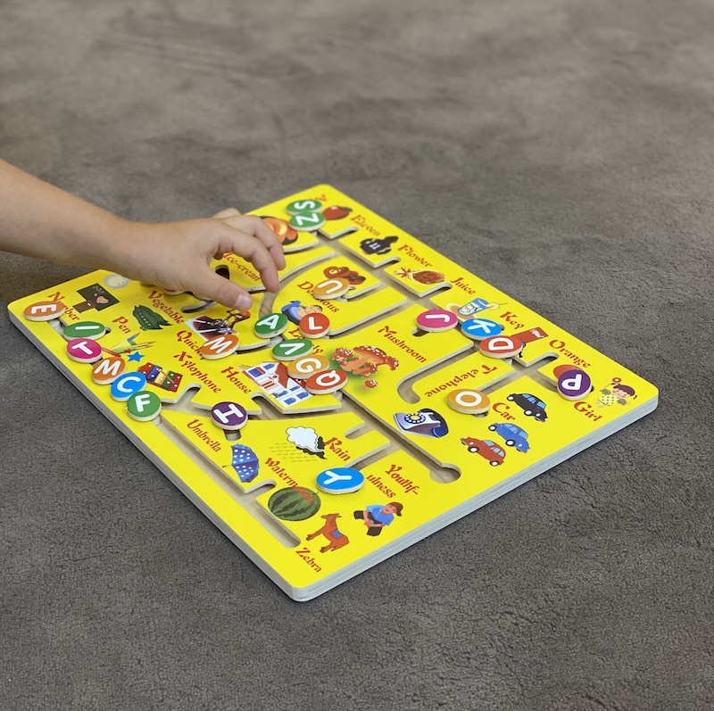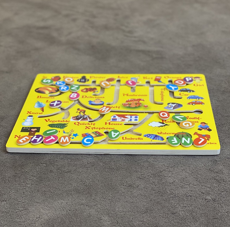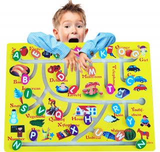 Edukativní hračka v podobě labyrintu, pomocí které se děti zábavnou formou mohou seznámit s písmenky a základy angličtiny. Cílem labyrintu je totiž přiřadit písmenko ke správnému obrázku. Záludný labyrint navíc učí děti logickému uvažování, trénuje motorické schopnosti, trpělivost a soustředění. Labyrint ve veselém pestrobarevném provedení je vyroben ze dřeva. Seznamte své děti hravou formou s písmenky a základy angličtiny.