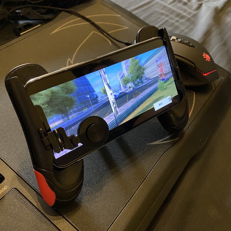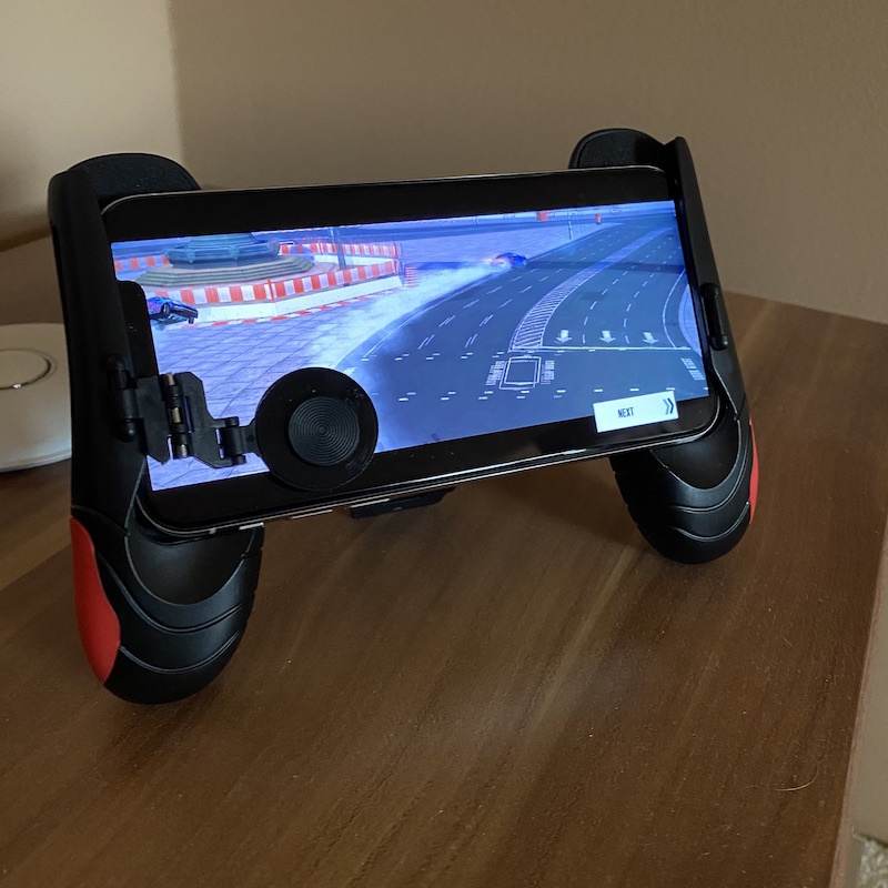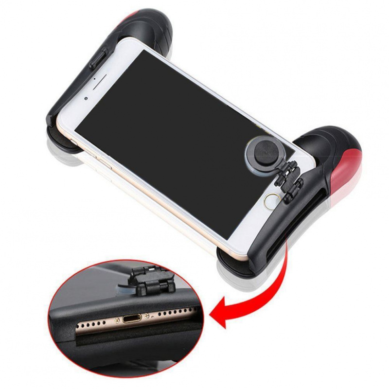 Hrajte hry na mobilním telefonu pohodlněji! Speciální držák s madly a přídavnou ovládací dotykovou podložkou je nastavitelný, šířku lze nastavit až do 17 cm, takže je vhodný pro většinu mobilních telefonů. Na zadní straně je držák opatřen vyklápěcím stojánkem, díky kterému můžete zcela pohodlně sledovat oblíbené filmy na mobilu. Praktický držák tak využijete nejen na hraní mobilních her, ale i na sledování vašich oblíbených pořadů. Držák je navíc po obou stranách opatřen otvory, takže můžete telefon nabíjet i během hraní her. Dotykový joystick je odnímatelný.