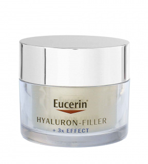 S přibývajícím věkem v pleti klesá vlastní produkce kyseliny hyaluronové, což vede k tvorbě prvních vrásek. Denní krém Eucerin Hyaluron-Filler + 3× Effect SPF 15 obohacený o kyselinu hyaluronovou, saponin a enoxolon bojuje s prvními známkami stárnutí suché pleti. Viditelně vyhlazuje jemné linky i hluboké vrásky, a stará se tak o mladší vzhled pleti. Poskytuje pleti účinnou ochranu proti předčasnému stárnutí způsobenému UV zářením a proti prohlubování vrásek a zároveň ji chrání před volnými radikály.
