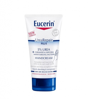 Krém na ruce Eucerin UreaRepair PLUS 5% Urea Hand Cream poskytuje velmi suché a hrubé pokožce rukou intenzivní a dlouhotrvající hydrataci. Unikátní kombinace složek - urea, ceramidy a další přirozené hydratační látky, v pokožce vážou hydrataci a obnovují její přirozenou ochrannou bariéru a odolnost proti vysychání až na 48 hodin, a to i po opakovaném mytí. Krém je vhodný pro péči o zralou pokožku a pokožku trpící onemocněními jako je xeróza, lupénka i o pokožku diabetiků. Také jako doplňková péče.
