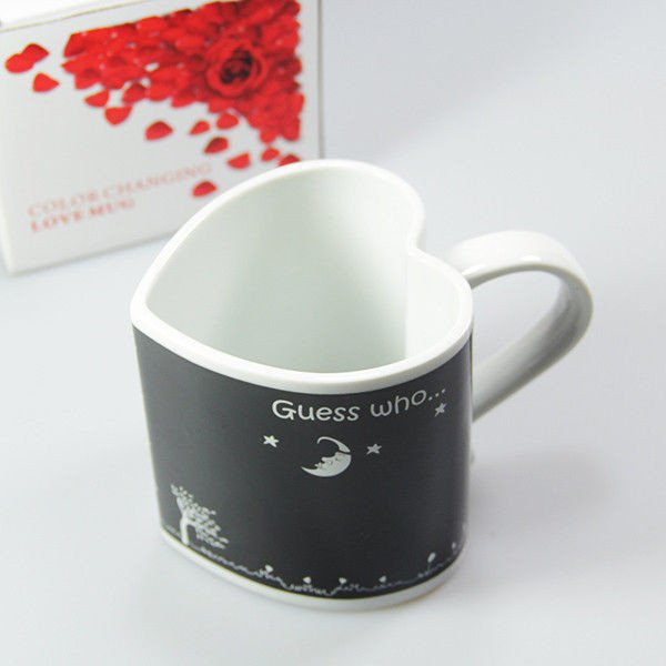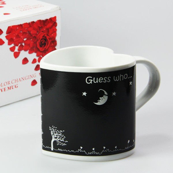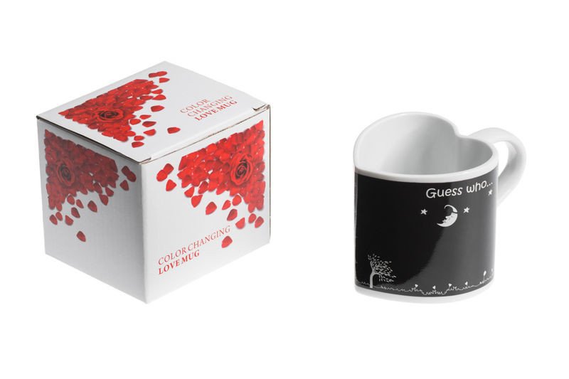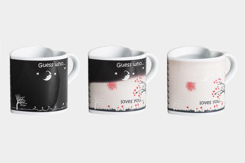 Kromě svého tvaru má tento hrnek v rukávu ještě jeden trumf – po nalití horkého nápoje zobrazí tu nejmilejší odpověď na otázku „…hádej co?“.