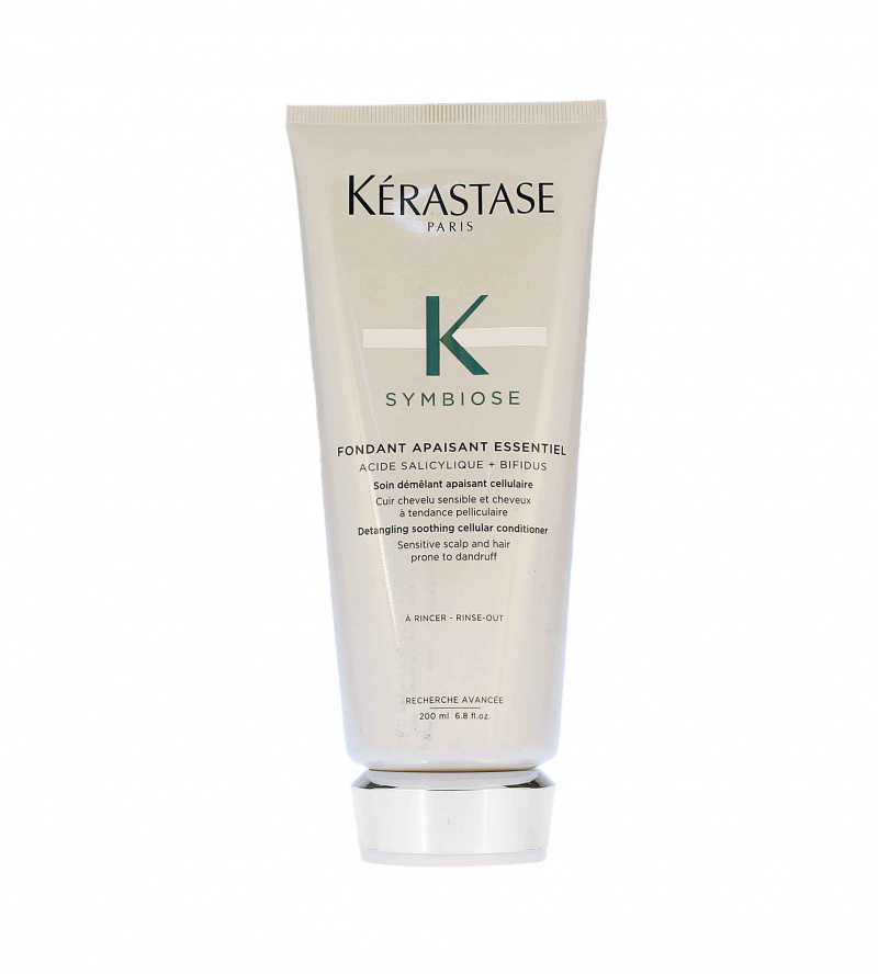 Zklidňující buněčný kondicionér Kérastase Symbiose Fondant Apaisant Essentiel představuje účinnou péči o citlivou pokožku hlavy se sklonem k tvorbě lupů, s výsledky již po 4 týdnech používání. Pečující složení bez sulfátů a silikonů už po prvním použití významně redukuje citlivost pokožky hlavy, usnadňuje rozčesávání a posiluje vitalitu vlasů. Kyselina salicylová umožňuje pokožce hlavy znovu volně dýchat a extrakt Bifidus posiluje její zdraví. Hydratační složky kondicionéru zmírňují nepříjemné pocity na vlasové pokožce a podporují zachování správné funkce kožní bariéry. Pokožka hlavy i vlasy jsou tak intenzivně ošetřeny bez zatížení. Kondicionér má bílou jemnou konzistenci balzámu, která společně s příjemnou vůní potěší všechny smysly.