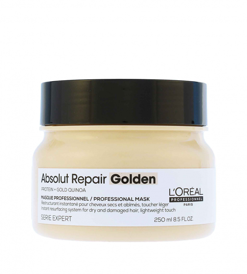 Intenzivní regenerační maska L'Oréal Professionnel Serie Expert Absolut Repair Golden díky svému složení hydratuje a regeneruje vlasové vlákno bez pocitu zatížení. Má krémovo-gelovou zlatou strukturu. Maska je obohacena o výtažky z obilného proteinu a zlaté quinoy. Poškozený povrch vlasů je okamžitě transformován, vlasy jsou hebké, lesklé a lehké na dotek.