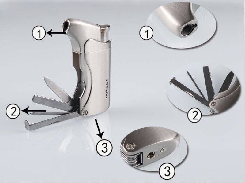 Tento multifunkční zapalovač v sobě spojuje praktického a spolehlivého zapalovače spolu se švícarským nožíkem!