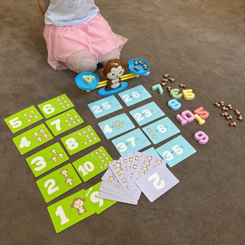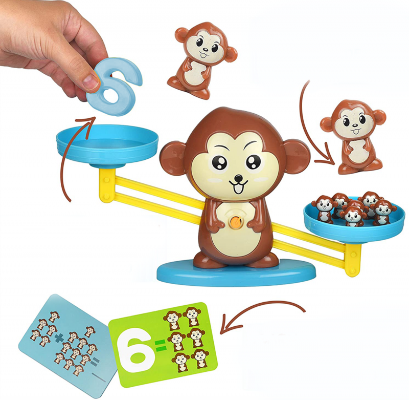 S touto skvělou hračkou budou děti počty bavit! Procvičování základů matematiky nebylo nikdy zábavnější. Na jednu stranu mističek vložte číslo a na druhou stejný počet malých opiček. Pokud bude výsledek správný, misky budou vyrovnané. Děti tak mají okamžitou kontrolu nad výsledkem. Sada opičí váhy s čísly je vhodná zejména pro předškoláky a prvňáčky. Balení navíc obsahuje i kartičky s různými matematickými příklady.