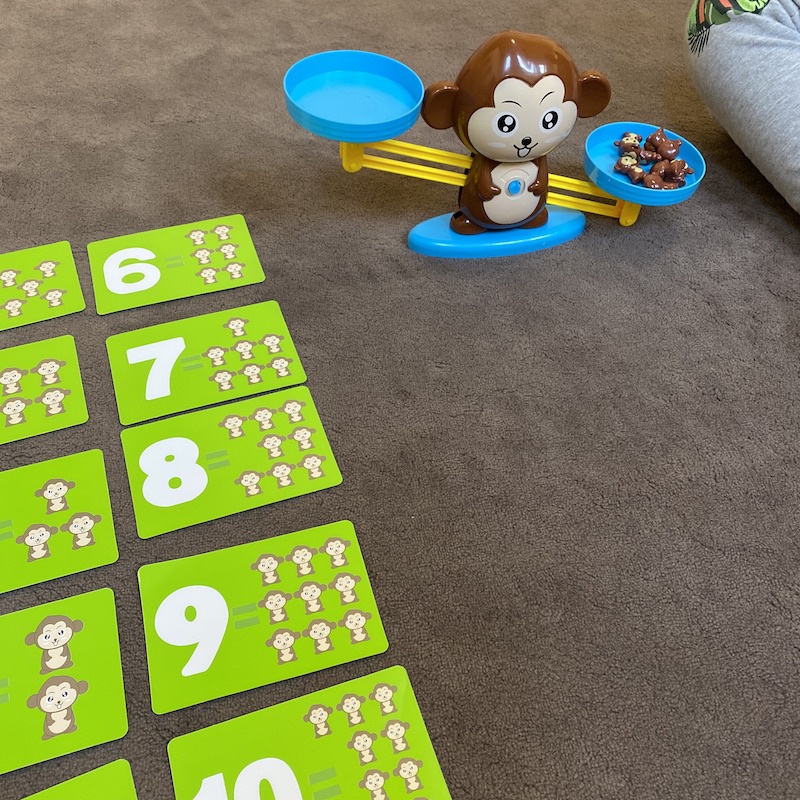 opička, misky, číslice, malé opičky, kartičky s počty