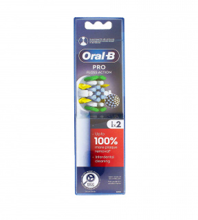 Náhradní hlavice Oral-B Pro Floss Action zajišťuje špičkovou a komplexní čistotu ústní dutiny. Její vlákna čistí povrch zubů, zatímco speciálně navržená vlákna MicroPulse dosáhnou hlouběji a čistí i hůře dostupné mezizubní prostory. Díky technologii CleanMaximiser indikační vlákna postupně zesvětlají a upozorní vás, že je čas na výměnu hlavice. V porovnání s manuálním zubním kartáčkem odstraní o 100 % více plaku než manuální kartáček.