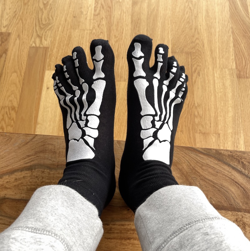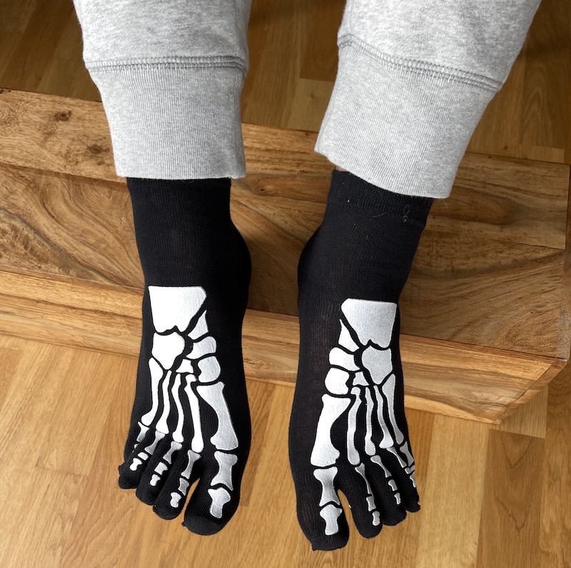 Stylové prstové ponožky s motivem kostlivce! Tyto neobyčejné ponožky s neobvyklým motivem se skvěle hodí nejen jako součást kostýmu, ale i na každodenní nošení. Pobavte své kolegy v práci, spolužáky ve škole nebo přátele na maškarním večírku tímto nevšedním vtipným doplňkem. Moderní prstové ponožky jsou také skvělým dárkem pro všechny lidi se smyslem pro humor.
