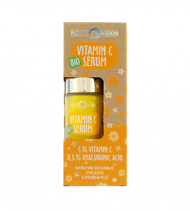 Pleťové sérum Purity Vision Bio Vitamin C je doslova receptem na zářivou pleť plnou vitality. S jeho průlomovým složením přírodních aktivních látek se vaše pleť promění v pružnou, vyhlazenou a mladistvě vypadající. Sérum strategicky kombinuje antioxidační vlastnosti vitamínu C a E a nízkomolekulární kyseliny hyaluronové pro maximální účinek v boji proti předčasnému stárnutí. Bio Aloe vera, extrakt z chia semínek a rakytníku spolu s vitamíny C a E rozjasňují matný tón pleti, viditelně ji zpevňují a redukují zarudnutí. Příjemná osvěžující vůně červené mandarinky nejen krásně provoní vaši pleť, ale i povznese smysly svým aromaterapeutickým účinkem.