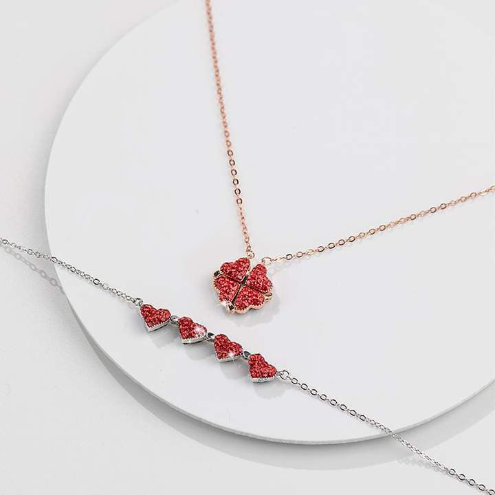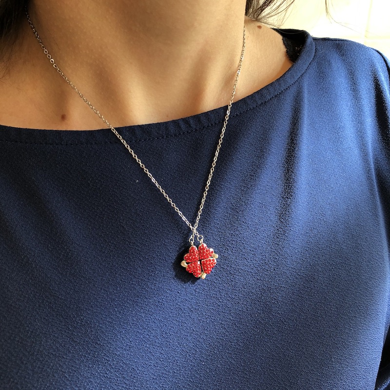 Originální oboustranný řetízek, který lze nosit na několik způsobů! Řetízek pro štěstí a z lásky stříbrné barvy je elegantním a jemným šperkem, který potěší každou ženu. Může jej totiž nosit podle nálady jako čtyřlístek anebo jako srdíčka vedle sebe. Jednotlivá srdíčka jsou krásně vykládaná třpytivými kamínky, a to buď romantické červené či elegantní černé barvy. Šperk tak lze krásně sladit s outfitem. Potěšte svou drahou polovičku třpytivým šperkem.