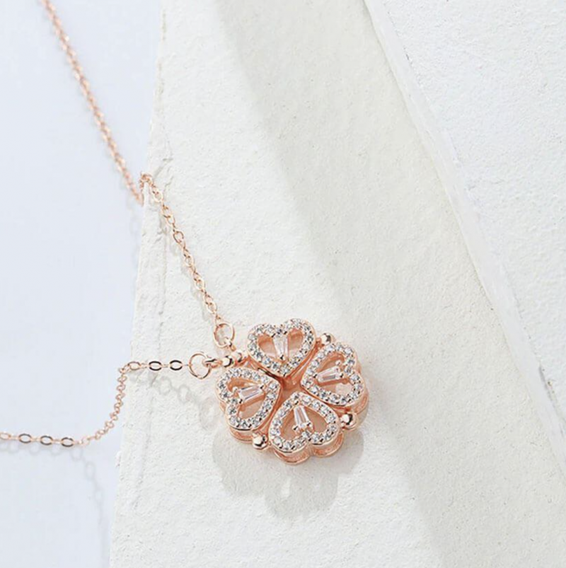Originální třpytivý řetízek, který lze nosit na několik způsobů! Řetízek pro štěstí a z lásky zlato-růžové barvy je elegantním a jemným šperkem, který potěší každou ženu. Může jej totiž nosit podle nálady jako čtyřlístek anebo jako srdíčka vedle sebe. Jednotlivá srdíčka jsou krásně vykládaná třpytivými kamínky. Šperk lze krásně sladit s outfitem. Potěšte svou drahou polovičku, kamarádku nebo maminku třpytivým šperkem.