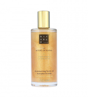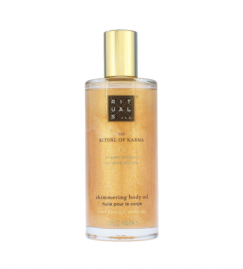 Pro zářivou pokožku použijte třpytivý tělový olej The Ritual Of Karma. Olej je z 96 % přírodního původu a ošetřuje pokožku kombinací jojobového, olivového a slunečnicového oleje. Rychle se vstřebává, oživuje unavenou pokožku a dodává jí energii, zatímco jemný perleťový lesk minerálních částic zajišťuje zářivý, rozjasněný vzhled. Třpytivý olej je jemně provoněný známou vůní bílého čaje a lotosového květu.