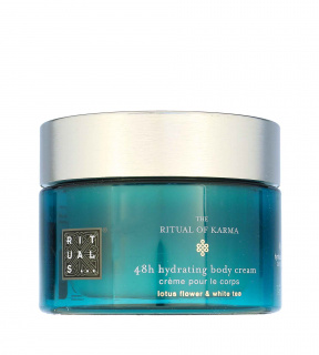 Luxusní tělový krém Rituals The Ritual Of Karma obohacený o komplex Hydra-Boost zajistí, že dehydratovaná pokožka bude opět pružná a omlazená. Tento jedinečný hydratační komplex z aloe vera, skvalanu a mořských řas pomáhá zklidnit suchou a žíznivou pokožku, uzamknout v ní vlhkost po sprchování a navrátit jí pružnost a elasticitu. Péče o pokožku se díky němu promění v osvěžující zážitek, navíc příjemně provoněný lotosovým květem a bílým čajem. Ponořte se do tohoto uklidňujícího rituálu každý den.