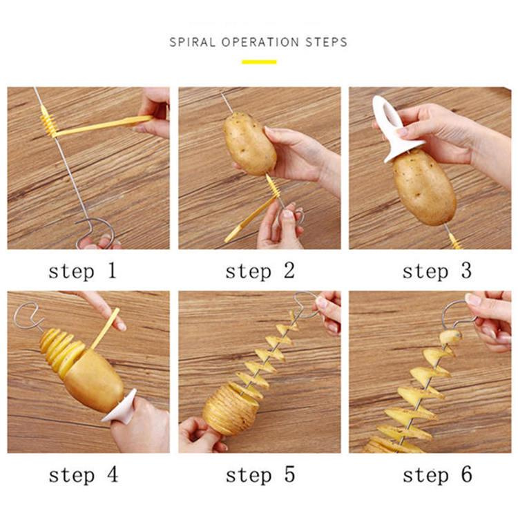Spirálový kráječ z nerezové oceli slouží pro domácí přípravu bramborových spirál. Milovníci domácích chipsů a hranolek zbystřete! Tento kráječ nabízí možnost, jak si v pohodlí domova nachystat křupavé bramborové spirály, bez připálených olejů a za minimální cenu. Sada obsahuje jeden spirálový kráječ s rukojetí a čtyři jehlice pro pečení nebo smažení bramborových spirál. Sada je i nápaditým a originálním dárkem.