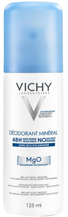 Minerální deodorant Vichy je obohacený o 5 různých minerálů, vitamín B5 a minerální vodu Vichy. Účinně odstraňuje zápach z podpaží a zanechává ho suché a svěží až po dobu 48 h. Neobsahuje hliník, alkohol ani parabeny, takže je vhodný i pro citlivou pokožku. Lze použít hned po holení.