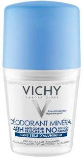 Hypoalergenní minerální deodorant Vichy 48h bez hliníkových solí, parabenů a alkoholu je vhodný i pro tu nejcitlivější pokožku. Proti potu bojuje minerálními látkami hořčíkem, sodíkem a vápníkem. Deodorant je obohacen o minerální vodu Vichy, která citlivou oblast podpaží zklidňuje a hydratuje. Deodorant má dlouhou účinnost až 48 h a je neparfémovaný. Aplikujte na čistou a suchou pokožku podpaží.