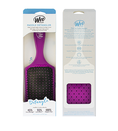 Díky o 20 % větší ploše než Wet Brush® Original Detangler®, tento Paddle Detangler usnadňuje kartáčování delších vlasů bez námahy. Exkluzivní, ultra-měkké štětiny IntelliFlex® snadno proklouznou zamotanými vlasy, minimalizují bolest a chrání před roztřepenými konečky a lámáním vlasů. Konstrukce AquaVent™ umožňuje odtok vody a přebytečného produktu pro snadné čištění. Ve chvíli, kdy jej použijete, ucítíte rozdíl a už nikdy nebudete chtít zkoušet jiný kartáč na vlasy. Paddle Detangler® je skvělý pro všechny typy vlasů!
