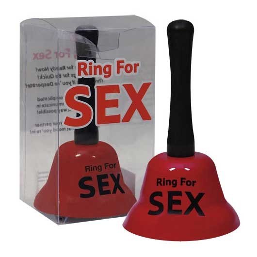 Kovový zvoneček s plastovým držákem, nastříkaný na červeno a s nápisem „Ring For SEX“ použijte vždy, pokud máte pocit, že váš partner nebo partnerka na vás nemá čas, nebo netuší, že jdou na vás choutky na milování. Ihned pochopí, že je potřeba zbystřit a věnovat se jiným aktivitám.